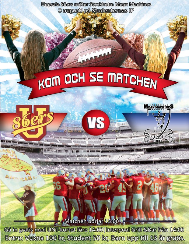 Säker seger mot Mean Machines Det var inte lätt att spela bländande fotboll på årets varmaste dag. Men Uppsala 86ers gjorde vad de behövde och bärgade den viktiga segern mot gästande Stockholm Mean Machines. Redan i 86ers första drive såg det ut som om Johannes Nilsson sprungit in en Touchdown men det visade sig att det var holding på en Uppsalaspelare och poängen ogillades. Så Uppsala fick punta och det var enda gången under matchen de tvingades till det. Uppsala stoppade Stockholmarna i nästa drive och lyckades efter det ända från egen 9-yardslinje ta bollen med fina passningar från Matt Bassuener till Amat Jobe och bra springspel av Johannes Nilsson göra TD efter en avslutande 7-yardspassning från Matt till Amat. Även vid nästa drive gjorde 86ers TD men den här gången sprang Amat in bollen från 5 yards. Dramatisk sista minut Sista minuten av den första halvleken blev lite dramatisk där Uppsalas försvar sprang bort sig och släppte till en 37-yards passning från Markus Hegbo till Anders Hollqvist. Det resulterade i att Hollqvist två spel senare kunde göra TD på en 20-yardspassning från Hegbo. Eftersom Uppsala missat sina extrapoängsförsök tidigare i matchen blev det lite nerv igen när Mean Machines reducerade till 8-12 med bara 25 sekunder kvar av halvleken. Men Uppsala kunde med ett par passningar till Nicko Peterson och sedan en härlig löpning av Amat Jobe (43 yards) slutligen med en 3 yards pass från Matt till Amat med bara en sekund kvar gå till halvtidsvila med 18-8. Med bra defense skapade i början av den andra halvleken Uppsala sig riktigt bra ”fieldposition” och Robin Wikström sprang in en TD och den här gången satte Ludwig Löhr extrapoängen. Uppsala stoppade sedan Mean Machines igen och gjorde på nytt en TD. Den här gången var det Nicko Peterson som tog emot Matts passning. Extrapoängen satt och ställningen var 32-8. Ganska avgjort. Tufft försvar av Uppsala igen gav på nytt ett bra läge från 14 yards som Johannes Nilsson elegant sprang in för ytterligare en Uppsala TD. Löhr satte extrapoängen igen. 39-8. Det såg ut som om Uppsala skulle lyckas stoppa Mean Machines igen vid Stockholmarnas nästa drive men i ett desperat försök till långpass från Markus Hegbo i fjärde försöket som gick över sidlinjen dömdes Nicko Peterson för en sen knuff och helt plötsligt så hade Mean Machines bollen på 20 yardslinjen. Och därifrån lyckades Hegbo med en snygg passningn till Anders Hollqvist snygga till siffrorna något. 39-14. Nicko revanscherade sig i nästa drive då han tog emot en svår passning från Matt Bassuener precis innanför linjen och efter Ludwig Löhrs godkända spark blev det 46 -14 vilket även blev slutresultatet. Bra insats Sammanfattningsvis så ska självklart Uppsala få godkänt för sin insats. Man gjorde TD på alla sina drivar utom den första där Nilssons TD blev bortdömd. Några olyckliga spel släppte till poäng för Stockholmarna men defense gjorde trots de två missarna en habil insats. Tyvärr blev Uppsalas Jamal Hussen olyckligt tacklad och slog armbågen ur led tidigt i matchen. Det ska mycket till om Jamal kommer tillbaka den här säsongen. Det innebär att Uppsala nu har ett flertal nyckelspelare på skadelistan. Gustav Kierbinski och Fabian Söderberg kanske kan komma tillbaka men när är osäkert. Nästa vecka kommer Örebro på besök till Uppsala. Vinst i den matchen och slutspelsplatsen är säkrad. Men ska laget lyckas med det så får inga misstag begås. Uppsalas amerikanske Quarterback Matt Bassuener gjorde sin bästa match den här säsongen. 20 av 24 passningar nådde sina mål och totalt passade han för 199 yards. Amat Jobe gjorde en supermatch och Nicko Peterson som gick in som receiver istället för corner när Jamal Hussen blev skadad får plus även han, trots den onödiga sena tacklingen som ledde till Mean Machines andra TD. Johannes Nilsson sprang för 127 yards. Riktigt bra. Defense är Uppsalas styrka just nu. Och den här gången klev flera spelare fram som inte visat sig så mycket tidigare. Bland dem ska speciellt nämnas Wesley Peterson och Fredrik Zetterlund. Poänggörare: Amat Jobe: 18 Nicko Peterson: 12 Robin Wikström: 6 Johannes Nilsson: 6 Ludwig Löhr: 4 Här hittar du hela matchens statistik.