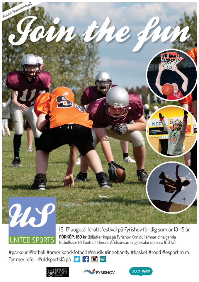 Amerikansk fotboll, Cheerdance, Streetbasket, Parkour, E-Sport, Roddsimulator, DJ:s, band som uppträder, badminton, innebandy, agility, fotboll och mycket annat under två dagar. Det är grunden i en helt ny Idrottsfestival i Fyrishovs Multihallar 16-17:e augusti. United Sports hemsida! Anmäl ditt lag HÄR! - United Sports är utvecklat tillsammans med en referensgrupp för att kunna passa dagens 13-15-åringar. För oss i Upplands Idrottsförbund är det oerhört spännande att få vara med att skapa tillsammans med ungdomar, säger Dag Söderberg, Idrottschef på Upplands Idrottsförbund. Frågeställningen om hur gör man ett Summercamp vändes upp och ned när ett ungt gäng från olika sporter och uttryckssätt träffades för att prata om vad de skulle vilja göra. Gamla koncept slängdes snabbt ut och nya saker kom in i stället. In med idrottsformer som inte är traditionella, som parkour. Låt idrotten möta andra uttryckssätt, som musik, bild och film. Förutom idrotta ska man kunna skapa, som att vara med i ett medieteam. Lekfullhet, men samtidigt skulle inte adrenalinet som tävlingsmomentet ger glömmas bort. - Genom diskussionerna föddes ett helt unikt turneringsformat, med korta 3 mot 3 matcher i många sporter, som flaggfotboll, men där man också kan bli totalsegrare i en Superturnering. För oss i Uppsala 86:ers var det självklart att säga ja när vi fick frågan om vi kunde ta på oss att vara huvudarrangörsförening. United Sports är ett spännande koncept för framtiden, säger Martin Söderberg i Uppsala 86:ers. Alla deltagarna på United Sports får också fritt inträde på seriefinalen i amerikansk fotboll mellan Uppsala 86:ers och Carlstad Crusaders på Studenternas den 17:e. En av aktiviteterna under United Sports är Cheerdance som leder fram till pausuppträdande under matchen på Studan. Bland arrangörsföreningarna finns Uppsala Parkour, Storvreta IBK, Uppsala Basket, Uppsala Akademiska Roddsällskap, Fyrisfjädern och GUSK som alla står för olika delar. En viktig roll har Uppsala kommuns fritidsgårdar som bidrar med bland annat musik & E-sport. - United Sports träffar rätt i vår målgrupp, och att blanda sport, musik och andra utryckssätt är något som uppskattas bland våra medlemmar. Det är också ett bra slut på sommarlovet, säger Stig Bernsten på Uppsala kommuns fritidsgårdar. Grundplåten i arrangemanget är en insamling från Uppsala Idrottsgala och konceptägare är Upplands Idrottsförbund, Fyrishov och Sportwire. - Den långsiktiga målsättning med vårt engagemang är att tillsammans med andra bygga en stor, unik, Idrottsfestival som sammanför idrotten på ett nytt sätt. Det här första året är ett sätt att testa konceptet i liten skala tillsammans med aktörer som tror på visionen, säger Fyrishovs vd Liisa Eriksson Hundertmark. United Sports i Fyrishovs multihallar 16/8: kl 11:15-21 17/8: kl 9.15-21 Pris: 150 kr (biljetter köps på Fyrishov, medlem i Uppsala kommuns frit-idsgårdar betalar 100 kr.) I biljetten ingår inträde båda dagarna, samt bad och inträde på matchen Uppsala 86:ers och Carlstad Crusaders. Kontaktuppgifter: Projektledare Ronnie Andersson, Upplands idrottsförbund, 0706-28 51 24