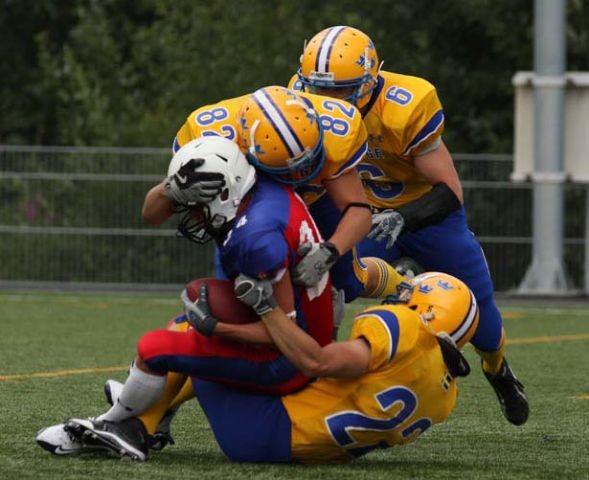Sverige, med Uppsalaspelarna Fabian Söderberg, Jonathan Vikström och Christian Taxén i laget, blev Nordiska juniormästare i amerikansk fotboll när de på lördageftermiddag i norska Kristiansand slog Danmark med 33 - 11. Sverige var stora favoriter men Danmark bjöd på tufft motstånd och finalen utvecklades till en riktig rysare. -Vi var helt enkelt bättre tränade än danskarna. Det var det som avgjorde matchen till vår fördel, säger assisterande förbundskaptenen Fredrik Pihlbäck efter matchen. Sverige tog ledningen med 6 - 0 efter en 38 yards pass från Uppsalas Fabian Söderberg till Damien Scanella. Extrapoängen sattes säkert av Mattias Kjellsson. Danmark kom efter en 15 yards penalty inom räckhåll för ett mycket snyggt fieldgoal från 38 yards av Rasmus Caröe Laursen. Sverige hade sedan läge för ytterligare en TD men missförstånd på tiden gjorde att man fick ytterligare gulflaggor för delay of game och när man sedan 4 sekunder före slutet av första halvlek försökte sig på en 42 yards fieldgoal så missades den. Redan i den första driven i den andra halvleken sprang Damien Scanella in en TD. Dvs, det trodde alla i publiken som inte såg den penalty svenskarna orsakat. Ingen TD då och heller inte på ytterligare två snygga runs. Men till sist blev det en förlösande TD genom Alexander Koyfis på en 20 yards pass från Fabian Söderberg med en lyckad extrapoäng. När sedan Ludwig Bauer stal bollen och sprang in en TD från 20 yards verkade det som om matchen skulle vara över. Men danskarna reste sig och kunde efter mycket om och men få in en TD på en pass från 7 yards. Avsikten var sen att göra en extrapoäng på en kick men Sverige blockade den. Danskarna kunde dock plocka upp bollen och springa in en 2:a istället. Med ställningen 20-11 gick man in i sista kvarten och Sverige dominerade då fullständigt. - Ludwigs pick gav oss lite andrum och danskarna kunde inte komma igen efter det, avslutar Fredrik Pilbäck som nu kommer ta över som förbundskapten för juniorerna efter tidigare förbundskaptenen Jan Jenmert. Sverige gjorde ytterligare två TD:s i den sista kvarten och slutresultatet 33-11 fastställdes av Mattias Kjellsson på en extrapoint. Statistik från matcherna kan du ladda ned här: Bilder kan du se HÄR: