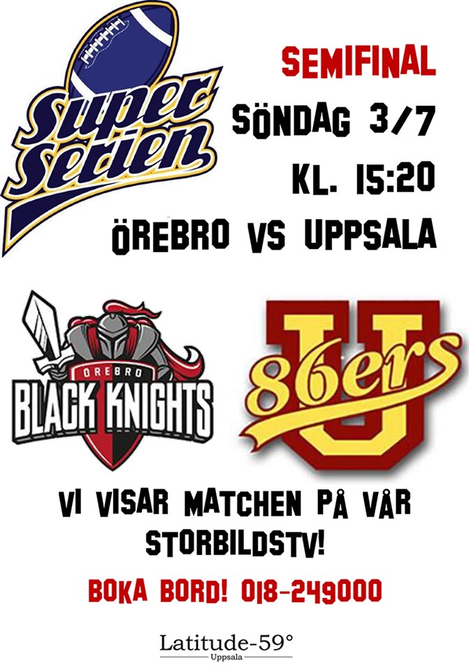 Om du inte hinner åka till Örebro så är ett bra tips att du tar dig till Latitude-59° så att du kan se semifinalen från Behrn Arena Mellan Black Knights och 86ers på deras storbildsskärm. Sändningen startar 15:20 på söndag 3 juli. Boka gärna bord på 018-24 90 00.
