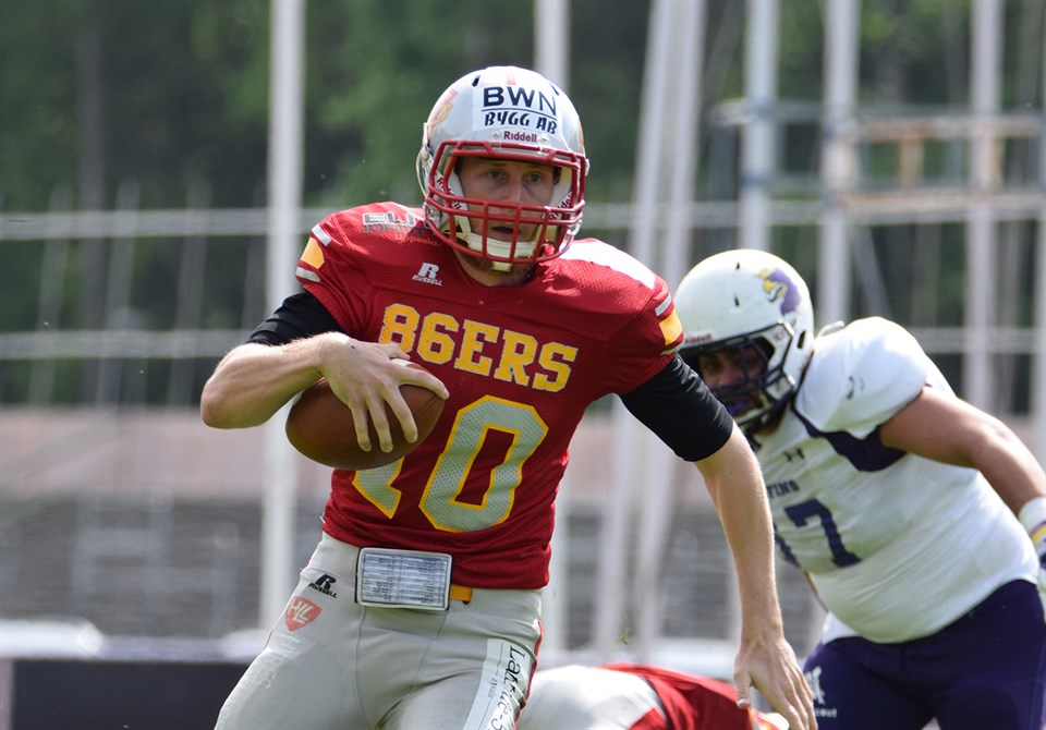 Det är lätt att bli imponerade av Carlstad Crusaders anfall. Så utspelade som Uppsalas normalt så stabila försvar blev i lördagens match var oväntat. Tur att 86ers anfall stundtals spelade riktigt bra så att matchen hölls vid liv åtminstone en halvlek. Nu vann Crusaders med 59 - 20 efter 35 - 14 i halvtid. Du kan se hela matchen i repris om du klickar här. Och här är statistikrapporten I matchens första drive vandrade Carlstad mer eller mindre rakt igenom Uppsala försvar och tog efter bara någon minuts spel ledningen med 7-0 genom Josh Hartigans mottagning från Philip Juhlin. Sedan drev Uppsala bollen riktigt bra med varierat spel ändå tills 86ers QB Jared Stegman kastade en interceptoion och Carlstads Johan Magnusson kunde springa in en pick-6 från 90 (!) yards. Uppsala kom igen Men Uppsala lät sig inte nedslås utan Jared Stegman revanscherade sig med en fin passning till Ricardo Miller som reducerade till 7 -14 efter extrapoäng satta av Alexander Wikström. Men Crusaders trummade på och deras duktige QB Philip Juhlin hittade André Holgård med en av de där djupa passningarna som Uppsala haft en tendens att släppa till lite för ofta. Men på nytt kunde Uppsala kontra med en passning från Jared Stegman, den här gången till Chiam James och matchen kändes ändå lite levande med ställningen 14-21. Dahre punkterade matchen Men eftersom Uppsala försvar inte kunde hålla tätt så punkterade Carlstads Jacob Dahre mer eller mindre matchen med två TD:s och halvtidsledning med 35 - 14 för Crusaders. En tidig TD av Jonathan Wahlgren efter en mycket fin pass från Jared Stegman i början av den andra halvleken rörde inte mästarna nämvärt som öste på med poäng och ohotade vann med 59 - 20. Om någon gott ska komma ut den här matchen för 86ers så var det lektionen i hur amerikansk fotboll ska spelas som de fick av Crusaders. Trots att Crusaders inte ens hade 30 spelare med i matchen var de egentligen överlägsna. Att Uppsala tilläts göra tre touchdowns var mer Uppsalas förtjänst än misstag från Crusaders. Att något lag ska kunna slå Crusaders i år känns osannolikt. Match om att slippa Crusaders på fredag 86ers får fokusera på nästa match där de möter Tyresö Royal Crowns på bortplan på fredag. Den kampen handlar om att lägga beslag på tredjeplatsen i serien och slippa Carlstad i en semifinal. Slutresultat: 20-59 Uppsala 86ers – Carlstad Crusaders, 20 - 59 (7-21, 7-14, 6-14, 0-10) Publik: 273 Poänggörare: Uppsala 86ers: Chiam James, 6 Ricardo Miller, 6 Jonathan Wahlgren, 6 Alexander Wikström, 2 Carlstad Crusaders: Josh Hartigan, 18 André Holgård, 17 Jacob Dahre, 12 Viktor Toresson, 6 Johan Magnusson, 6 MVP Uppsala 86ers: Jared Stegman MVP Carlstad Crusaders: Philip Juhlin MVP O-line i Uppsala till Anders Karlssons minne vanns av Daniel Söderberg. Statistik: Pass: 86ers: 271 yards CC: 317 yards Receiving: 86ers: Ricardo Miller 122, Jonathan Wahlgren 60, CJ James 49 CC: Josh Hartigan 95, André Holgård 84, Jacob Dahre 52, Ruben De Reuter 55 Rushing: 86ers: 35 (Jonathan Wikström 25) CC: 190 (Brett Koepp 110, Philip Juhlin 48, Viktor Toresson 32) Foto: Mose Sharifat