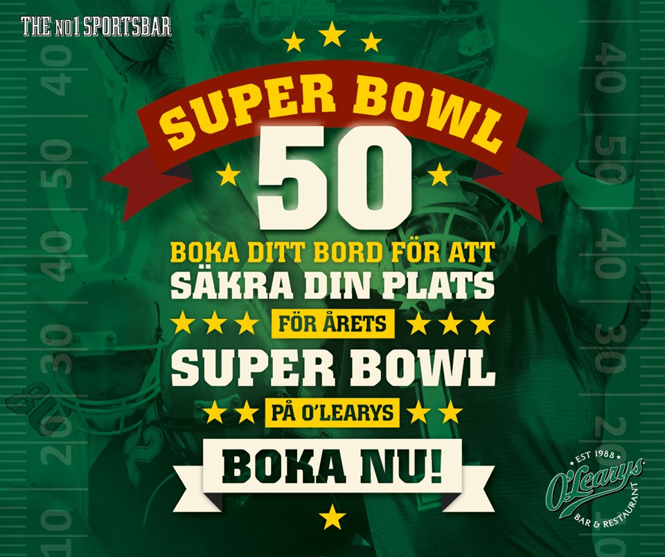 Nu på söndag kväll spelas Superbowl mellan Panthers och Broncos. Som vanligt träffas alla 86ers fans och följer den spännande finalen. I år är vi på O´Learys. Mat serveras från 21:00 och du får en 86ers hamburgare för 119:-. Anmäl dig via formuläret så vi kan förebereda O´Learys på antalet hamburgare de ska steka... ANMÄLAN!