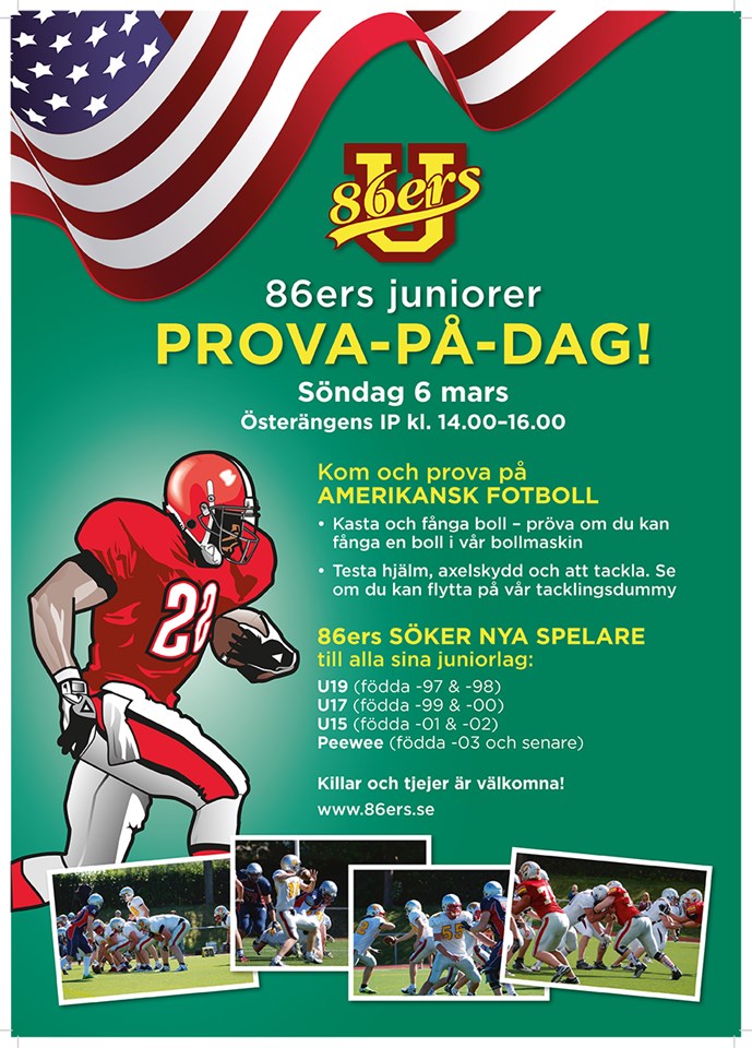 Kom och prova på amerikansk fotboll! Söndag 6 mars på Österängens IP kl 14-16. • Kasta och fånga boll – pröva om du kan fånga en boll i vår bollmaskin. • Testa hjälm, axelskydd och att tackla. Se om du kan flytta på vår tacklingsdummy 86ers söker nya spelare till alla sina juniorlag: U19 (födda -97 & -98) U17 (födda -99 & -00) U15 (födda -01 & -02) Peewee (födda -03 och senare) Killar och tjejer är välkomna!