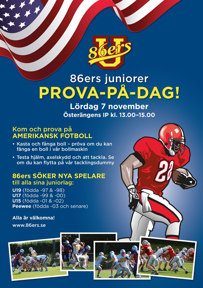 86ers juniorer - Prova-på-dag! Lördag 7 november Österängens IP kl. 13.00–15.00 Kom och prova på amerikansk fotboll • Kasta och fånga boll – pröva om du kan fånga en boll i vår bollmaskin • Testa hjälm, axelskydd och att tackla. Se om du kan flytta på vår tacklingsdummy 86ers söker nya spelare till alla sina juniorlag: U19 (födda -97 & -98) U17 (födda -99 & -00) U15 (födda -01 & -02) Peewee (födda -03 och senare) Alla är välkomna! Uppsala AFC 86ers 20 okt 2015 0kommentarer