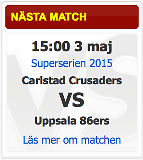 Nu kan du hitta alla matchtider för 86ers hemmamatcher i sommar. Dessutom har de flesta övriga föreningarna bekräftat sina hemmamatcher. Du hittar matchtider under respektive lag. Men här nedan ser du en sammanställning på alla 86ers hemmamatcher: U15: 16 maj: Matchstart: 16:00 (Tillgång till planen 15:30) Motståndare: Västerås Arena: Österängen 7 juni: Matchstart: 12:15 (Tillgång till planen ca 12:00) Motståndare: Karlskoga Arena: Österängen 27 juni: Matchstart: 13:00 (Tillgång till planen ca 12:00) Motståndare: Örebro Arena: Österängen 15 aug: Matchstart: 16:30 (Tillgång till planen ca 16:00) Motståndare: Karlstad Arena: Österängen U17: 16 maj: Matchstart: 19:00 (Tillgång till planen ca 18:30) Motståndare: Västerås Arena: Österängen 7 juni: Matchstart: 09:15 (Tillgång till planen 09:00) Motståndare: Örebro Arena: Österängen 9 aug: Matchstart: 11:00 (Tillgång till planen 10:30) Motståndare: Karlstad Arena: Österängen 29 aug: Matchstart: 13:00 (Tillgång till planen ca 12:00) Motståndare: Karlskoga Arena: Fyrisfjädern U19: 30 maj: Matchstart: 13:00 (Tillgång till planen ca 12:30) Motståndare: Arlanda Arena: Österängen 22 aug: Matchstart: 12:00 (Tillgång till planen 11:30) Motståndare: Stockholm Arena: Österängen 29 aug: Matchstart: 16:30 (Tillgång till planen 16:00) Motståndare: Jämtland Arena: Österängen 5 sep: Matchstart: 09:00 (Tillgång till planen 08:30) Motståndare: Västerås Arena: Österängen Seniorer: 17 maj: Matchstart: 16:00 (Tillgång till omklädningsrum 14:00) Motståndare: Örebro Arena: Studenternas 22 maj: Matchstart: 19:00 (Tillgång till omklädningsrum 17:00) Motståndare: Västerås Arena: Studenternas 31 maj: Matchstart: 16:00 (Tillgång till omklädningsrum 14:00) Motståndare: Karlstad Arena: Studenternas 17 juni: Matchstart: 19:00 (Tillgång till omklädningsrum 17:00) Motståndare: STU Arena: Studenternas 16 aug: Matchstart: 16:00 (Tillgång till omklädningsrum 14:00) Motståndare: Limhamn Arena: Studenternas